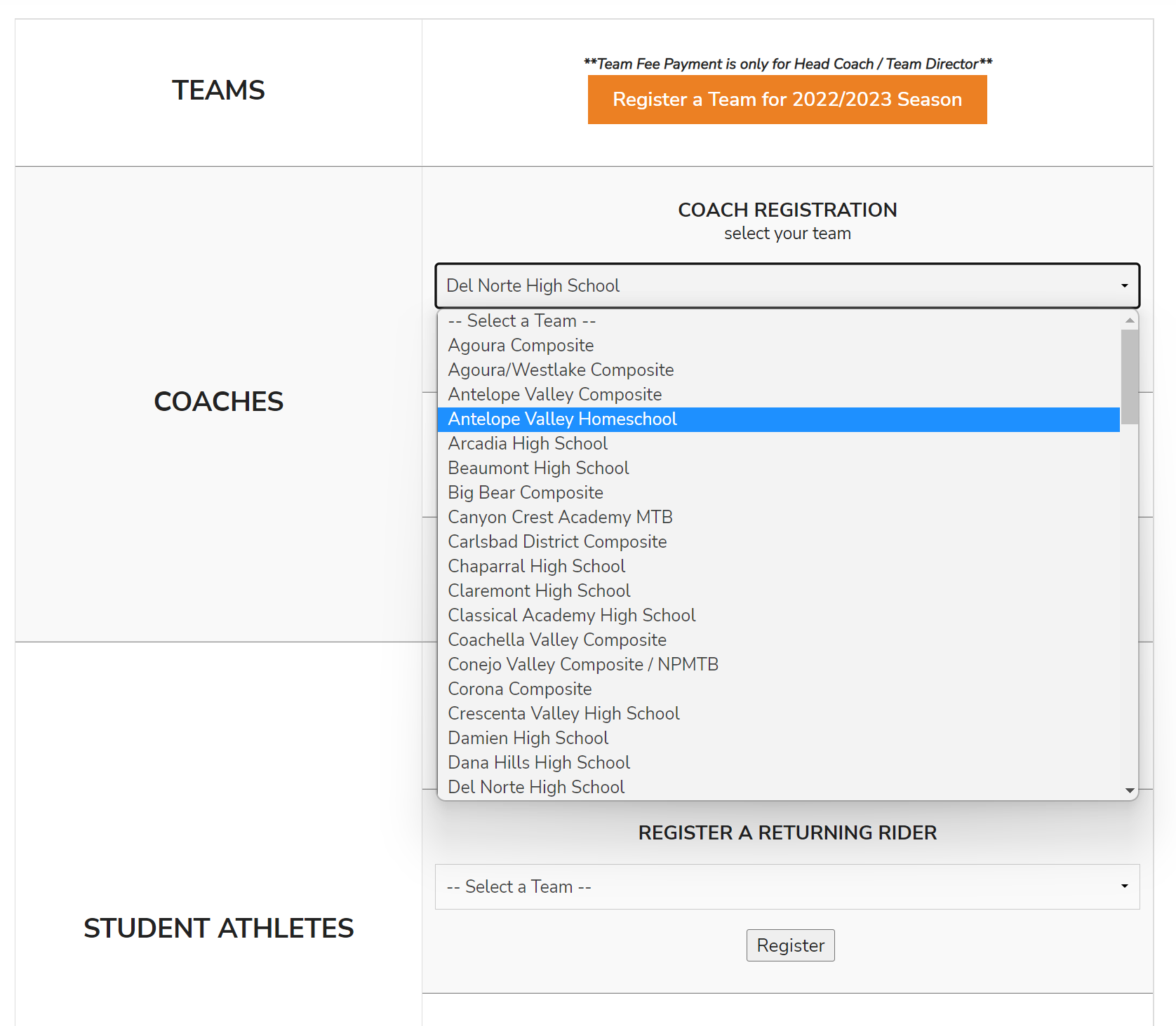 - Select your team from the drop-down menu in the Coaches section and click Register.