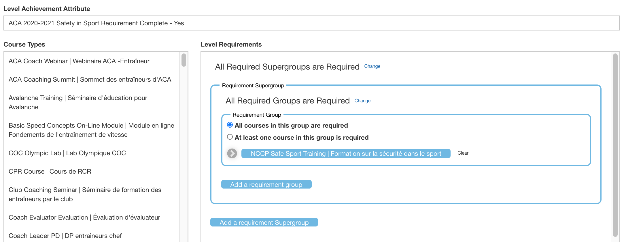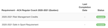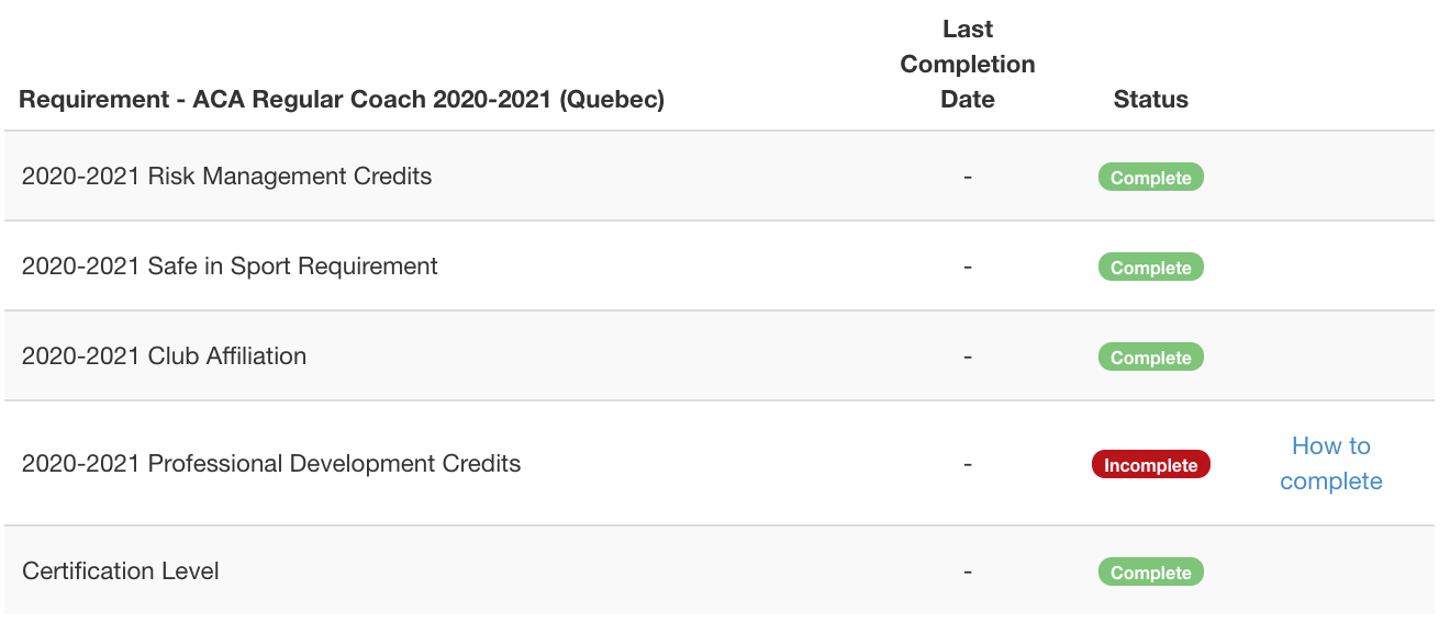 - A second process runs to check if members have completed any certification levels due to newly completed Course Records. In this case, there is a certification level that is achieved when someone completes that single course of "NCCP Safe Sport Training". This second process gives each applicable member the attribute "2020-2021 Safety in Sport Requirement Complete".