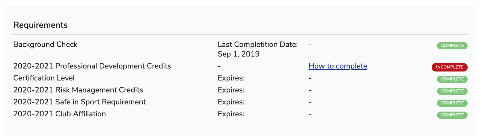 - The attribute "2020-2021 Safety in Sport Requirement Complete", is tied to the membership requirement "2020-2021 Safe in Sport Requirement" which automatically becomes complete.