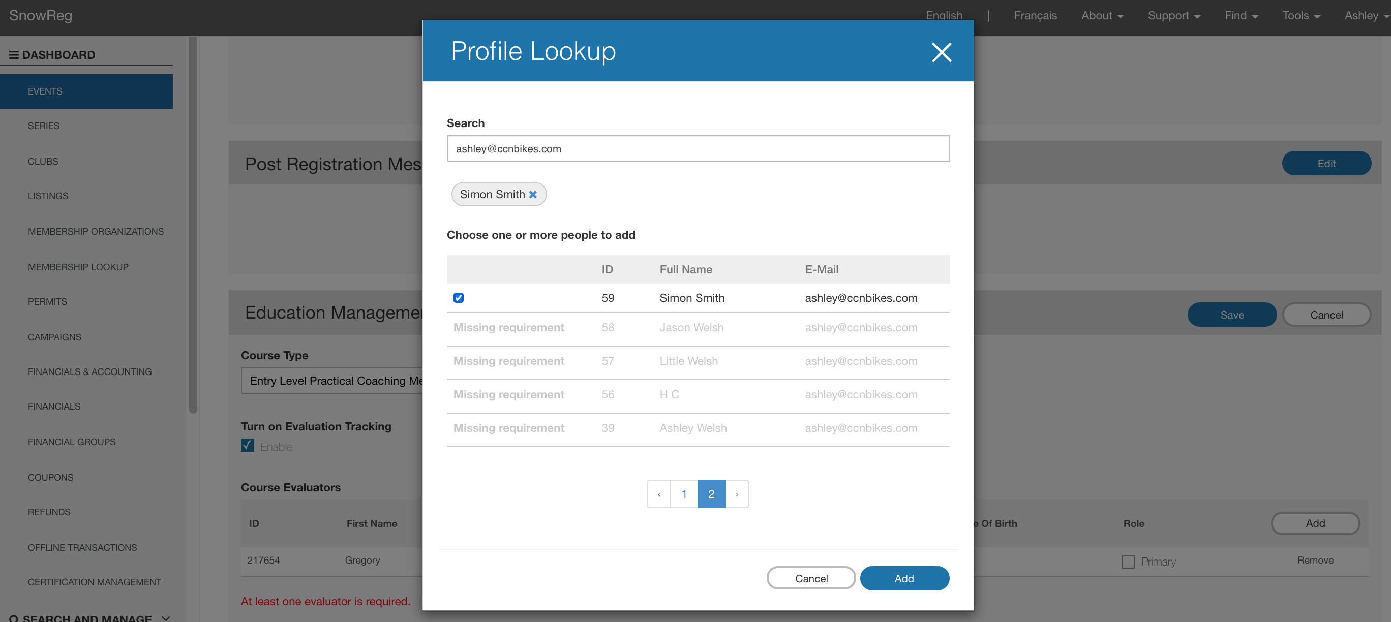 - When configuring an event with a CourseType that requires evaluation, you must specify at least one Evaluator. The evaluator must have a person record in the database and to select them, you must have visibility over that person record.