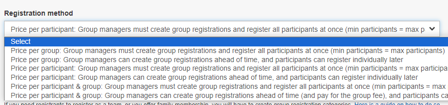 Registration method: This is where you will choose how groups will register for this category. You can select whether the groups pay a price per participant, per group or both.