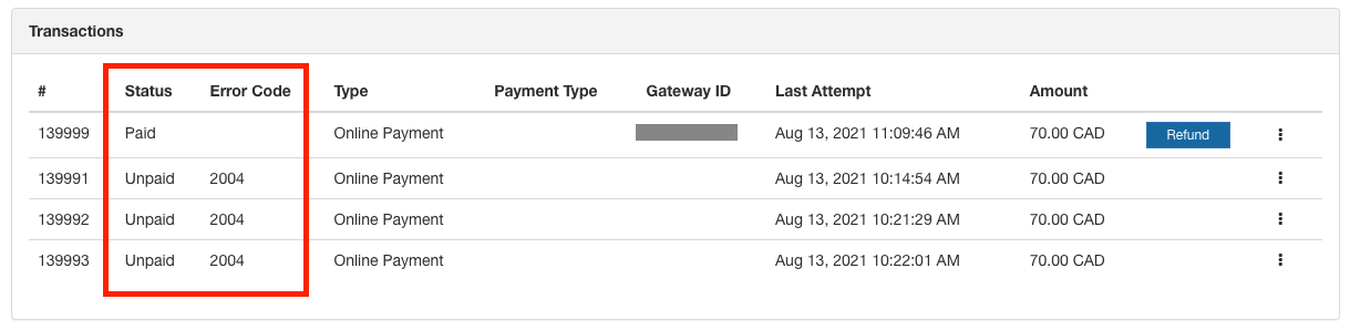 When payments are being declined by WePay (our payment processor), the transaction is marked in the order details as "unpaid" and when applicable, you can see an error code next to it: