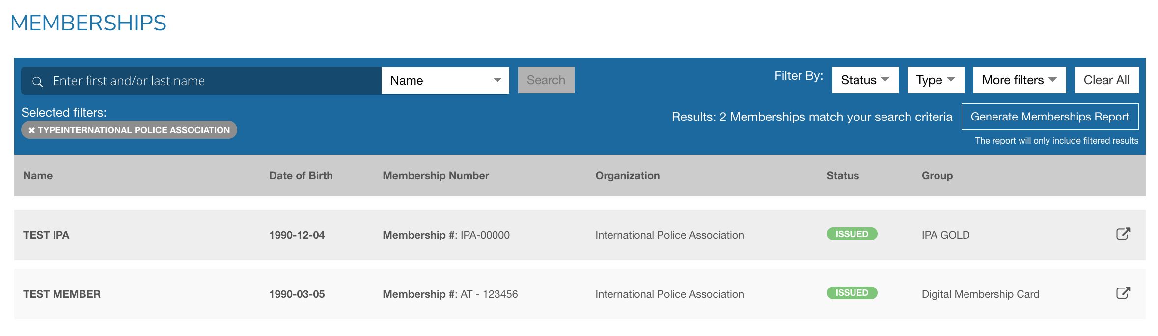 You can easily search for a specific member or filter membership types from the MEMBERSHIPS menu.