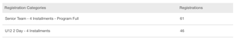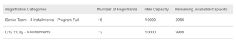 For instance, in the example below, you will notice that there are 16 and 12 unique registrants in those categories, contributing towards the maximum capacity. However, due to individuals making payments in 4 installments, the system has recorded 61 and 46 registrations (one registration per payment).