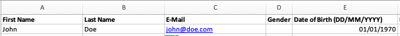 - First name / Last name / E-mail / DOB Mind the format (DD/MM/YYYY) - Mandatory
