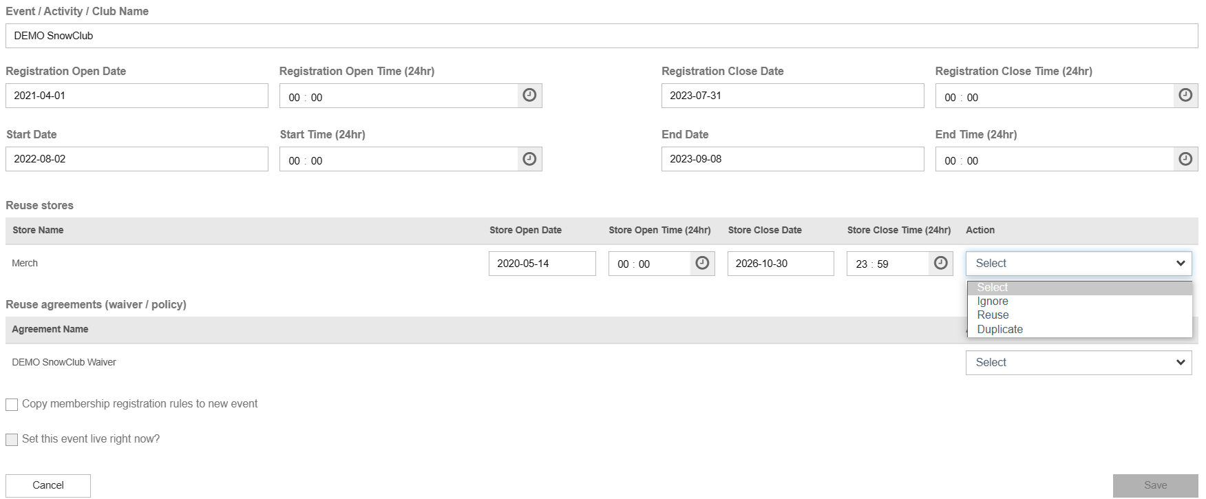 A new 'Create Registration Process Clone' window will pop up where you can update the details for the new event or club (name, registration start/end, open/close dates etc..)