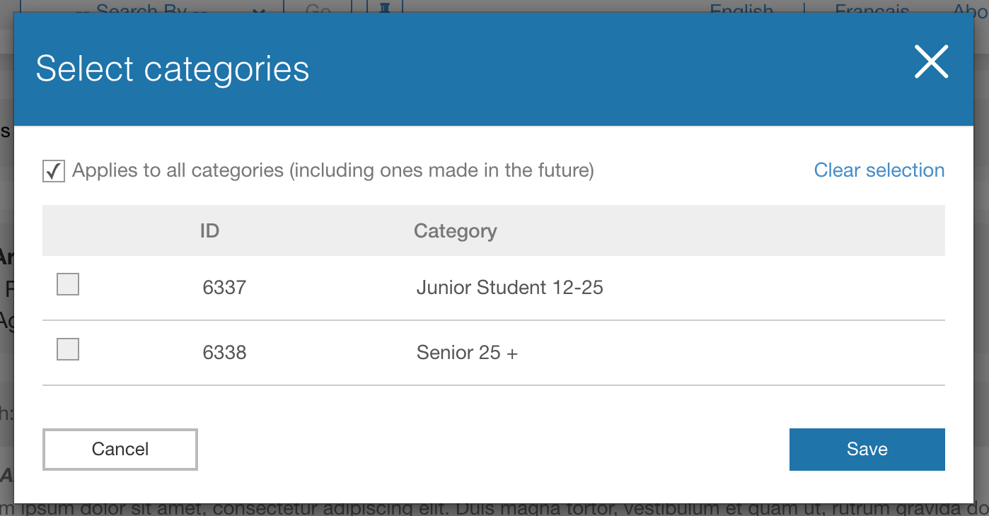 - To edit the display (meaning which registration categories the document will show up for), click on the white edit display options button, then choose the registration categories that the document should apply to by selecting them in the pop-up window: