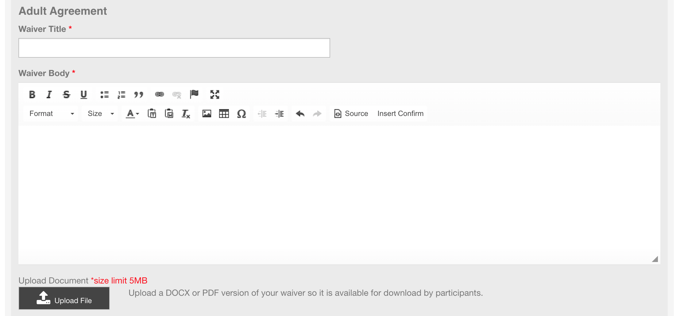 Note: you can add a PDF version of your waiver for people to download as a copy if they want to, by using the 'upload file' button.