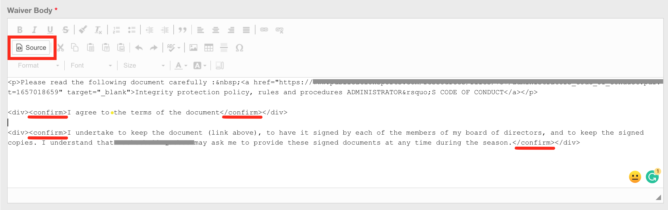 To highlight a section of a waiver with a "yellow background + red border", add class="yellow-bckg-red-border" into the opening tag of any element you want to be red-bordered with a yellow background.