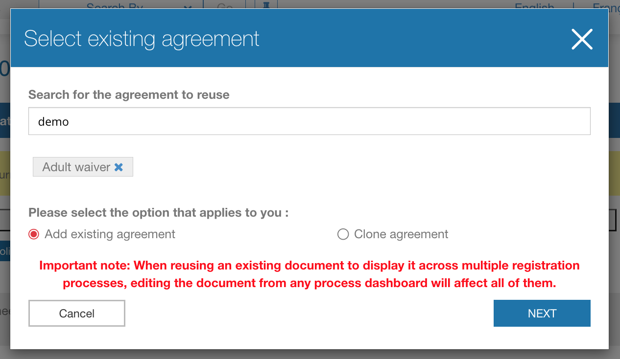 3. Search for the document you want to reuse by name, and select it. Then you need to choose between "add the existing agreement" OR "clone the agreement and create a copy".