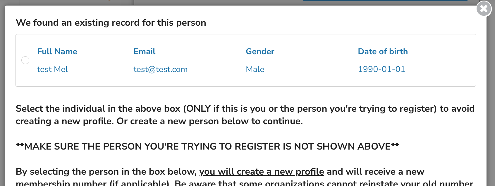3- If the person does have an existing profile on the system, you'll see the following pop-up, you MUST select the existing profile