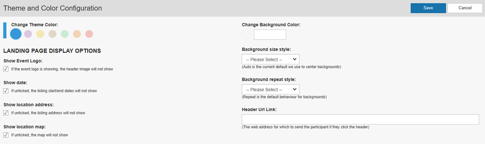 c) Landing page display options: You can choose to show the event logo, the listing start and end dates, the listing address and the map.