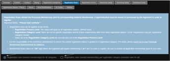 You can require membership by applying a rule uniformly to all your categories (select Registration Rules for all categories) or, you can instead require different memberships for each category (select per registration category (overrides rules for all)).