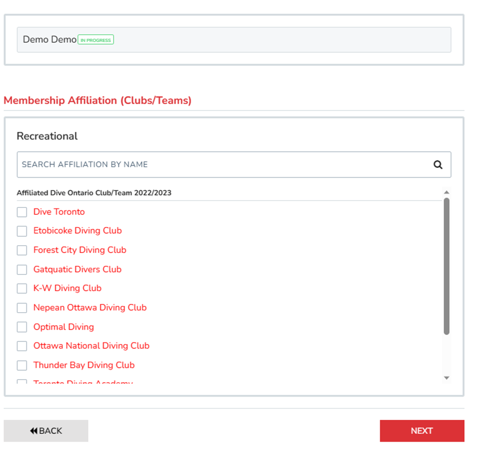 7.Please choose the club for which you want to register from the list of Affiliations. To select, check the desired option.
