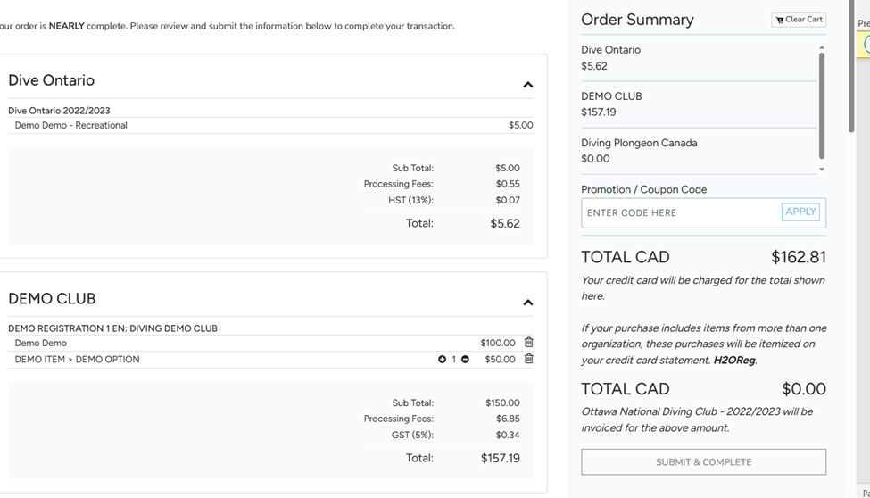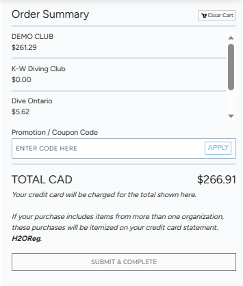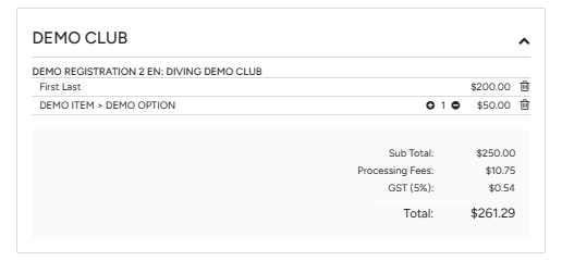 If you are part of a payment group, your credit card will be charged $0.00, and the fees will be attributed directly to your club.
