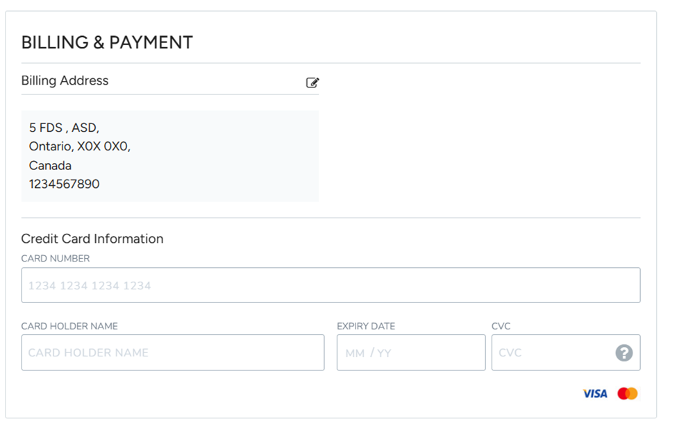 This box allows you to enter your banking information for payment. If your billing address is different from your residential address, click on the small icon to adjust the information.