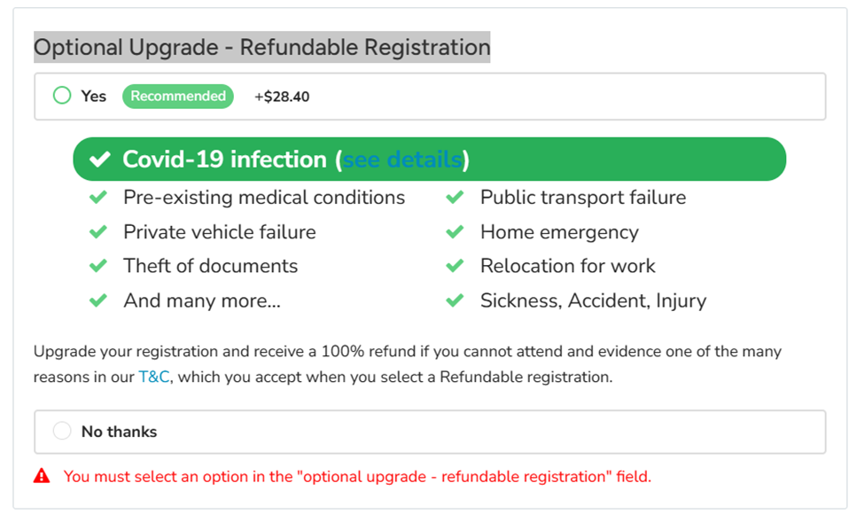 This option is optional. If this box appears on the submission page, make sure to check "No, thanks" if you are not interested; otherwise, you will not be able to submit your registration.