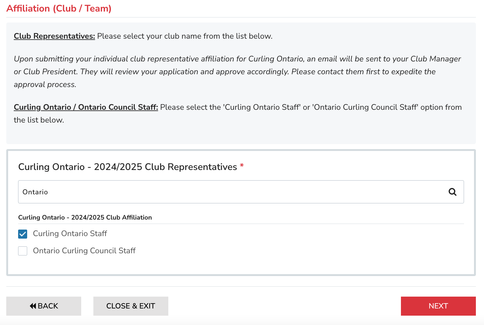 - At the affiliation step, choose "Curling Ontario Staff" and click NEXT.