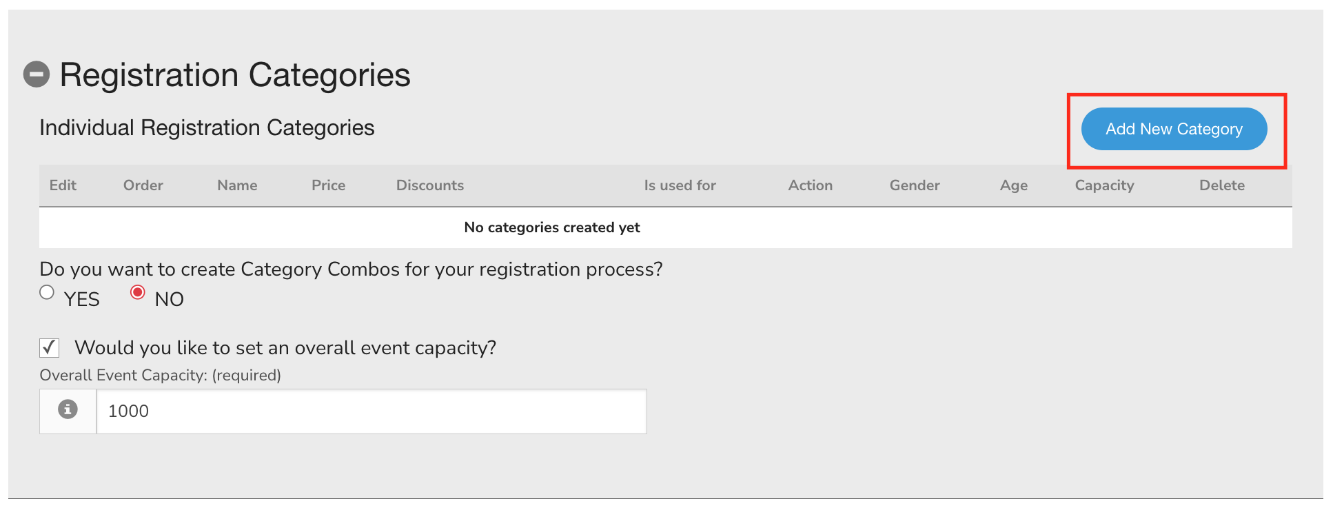 Registration categories are the list of registration options people will be able to select during the registration process based on their age, gender, and other additional restrictions. Each category can be set up with different types of restrictions, including max capacity:
