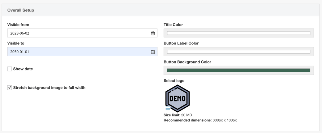 4- Define the 'Overall Setup': Set the tone with your desired Visibility Period, Title Color, Button Colors, and even upload your logo for a personalized touch.