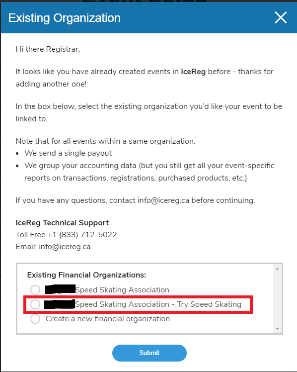 Select the organization (and financial account) to which you'd like to link your Try Speed Skating event. You MUST select the organization named "Club name or PTSO name - Try Speed Skating".