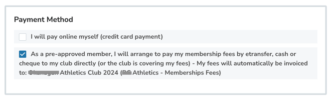 | Club would like to pay the National Membership Organization/Provincial Membership Organization membership fees on behalf of select member groups (ex: coaches or officials) | Create a dedicated registration category for those select member groups and request the payment group option to be presented for those membership options specifically. |