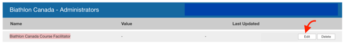 - From the "Attributes & Records" section, scroll down to the Biathlon Canada - Administrators" section, and mark the admin as a Biathlon Canada Course Facilitator