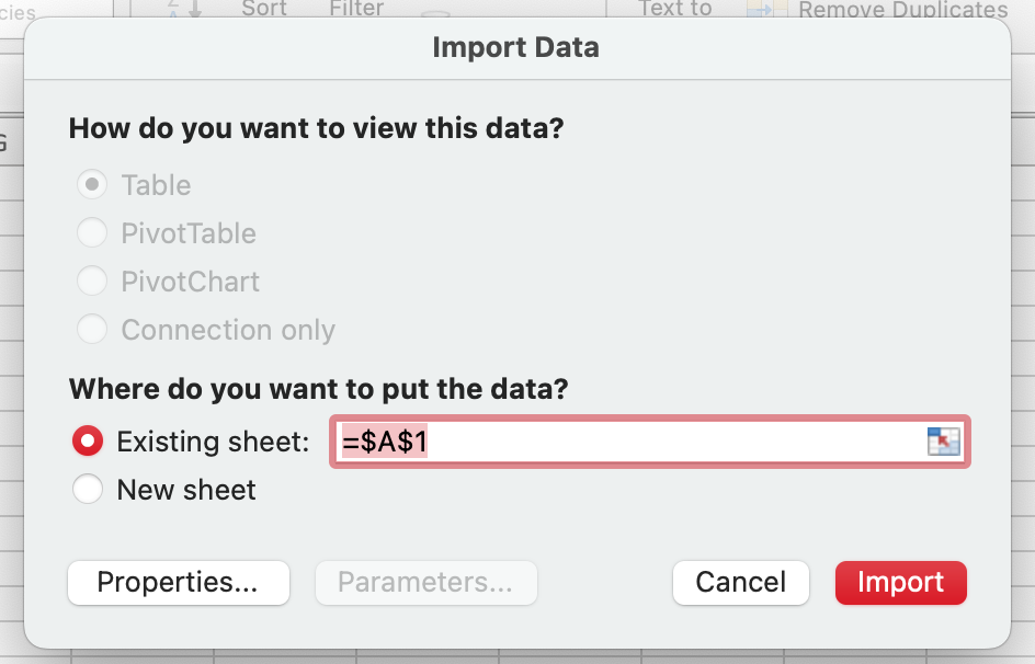 - In the final popup, select 'existing sheet' =$A$1, then IMPORT