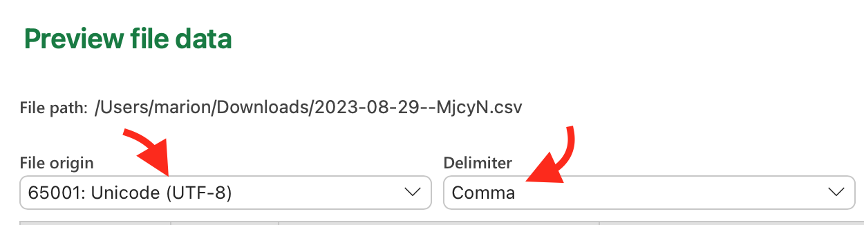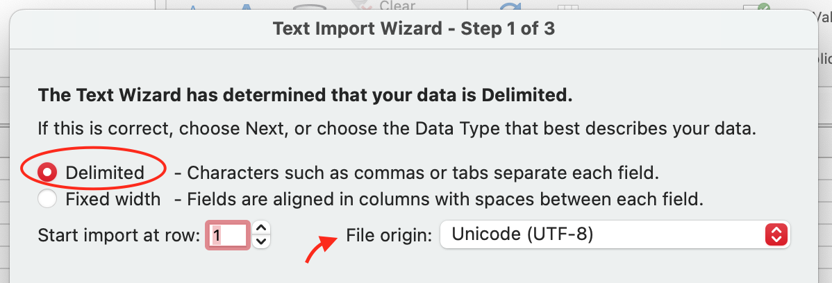 - In the 'text import wizard', select 'delimited' AND 'file origin' = Unicode (UFT-8)