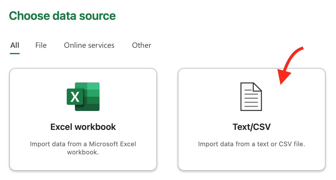 Then, choose data source as 'Text/CSV' - Select the CSV file you just downloaded from one of the Interpodia Dashboards