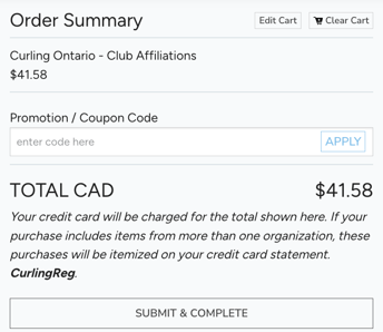 - Once in the cart, enter your credit card information, and click SUBMIT & COMPLETE