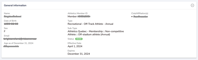 4- To update your membership information, you need to open your provincial membership details (Athletisme Quebec in the example above) which include: