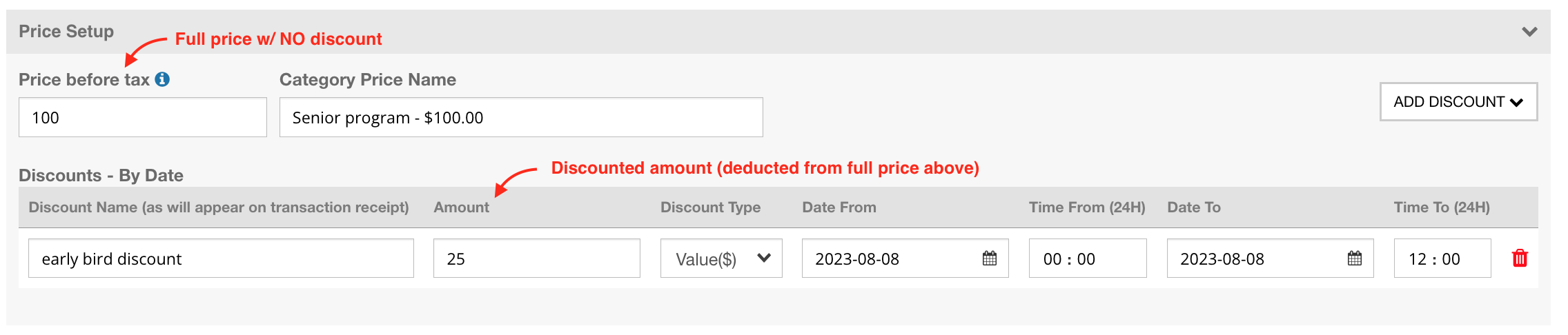 - The Discount Amount (before tax) represents the reduction in the final price before tax. If someone registers during the discount period, they will pay the final price before tax minus the discount amount.