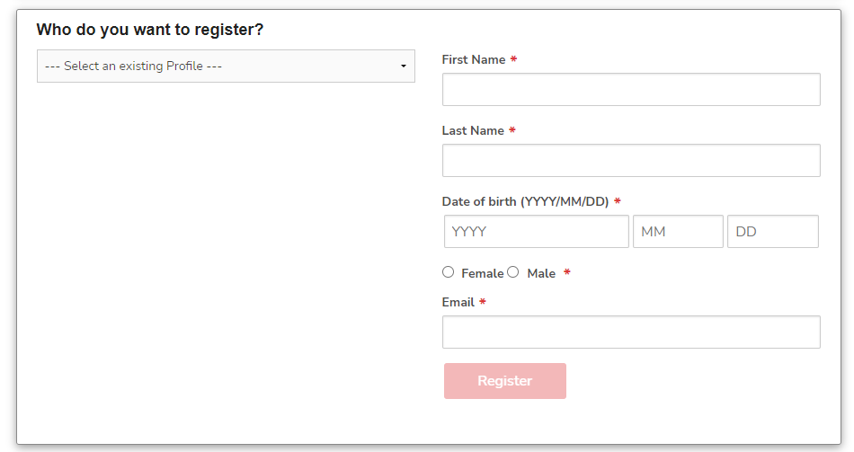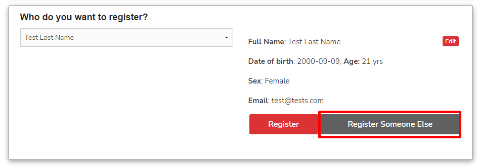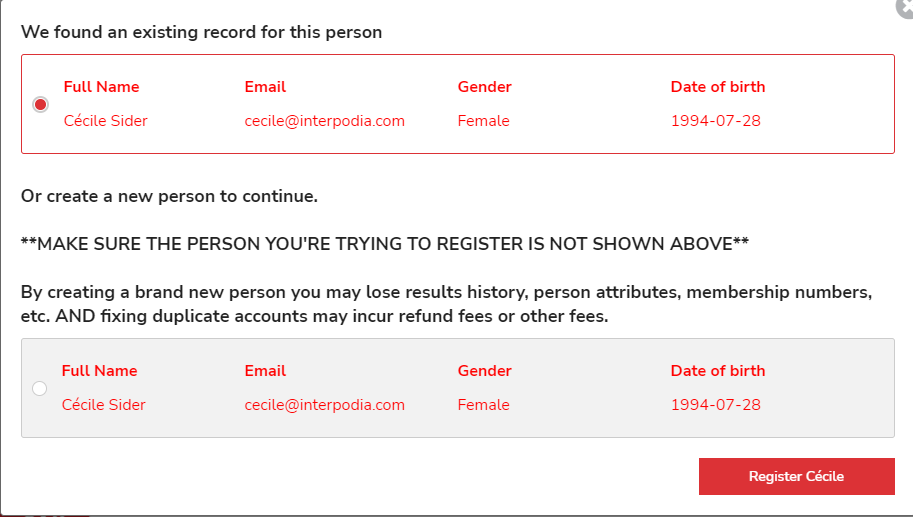 If the person you are registering already has an account, the system will prompt you to select the existing profile, make sure to do so: