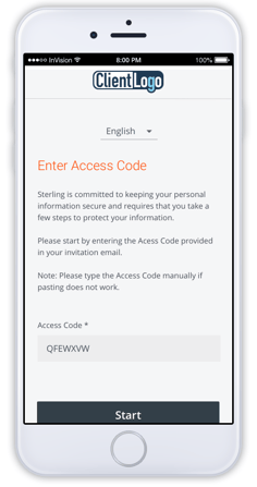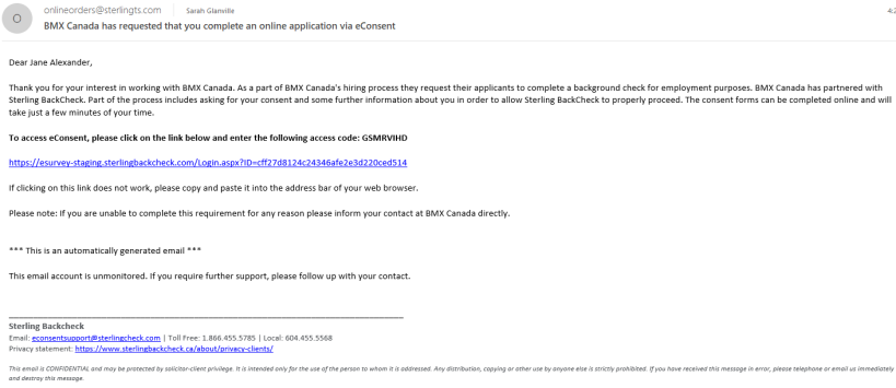 Step One: The candidate will receive an email containing a link and access code to the Sterling Backcheck candidate experience.