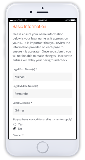 The candidate will begin entering their personal information and data that is required for their screening.