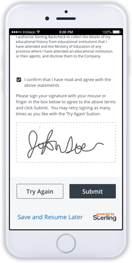 Next up the candidate can provide consent and their signature.