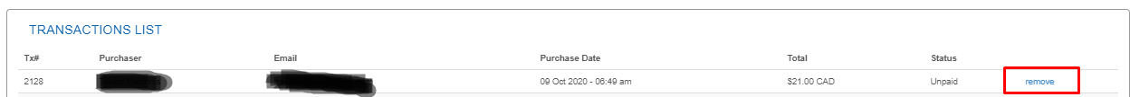 If you need to remove someone from a payment group because they accidentally submitted their registration to your payment group or for any other reason, select remove under transaction list to cancel that person's registration/membership: