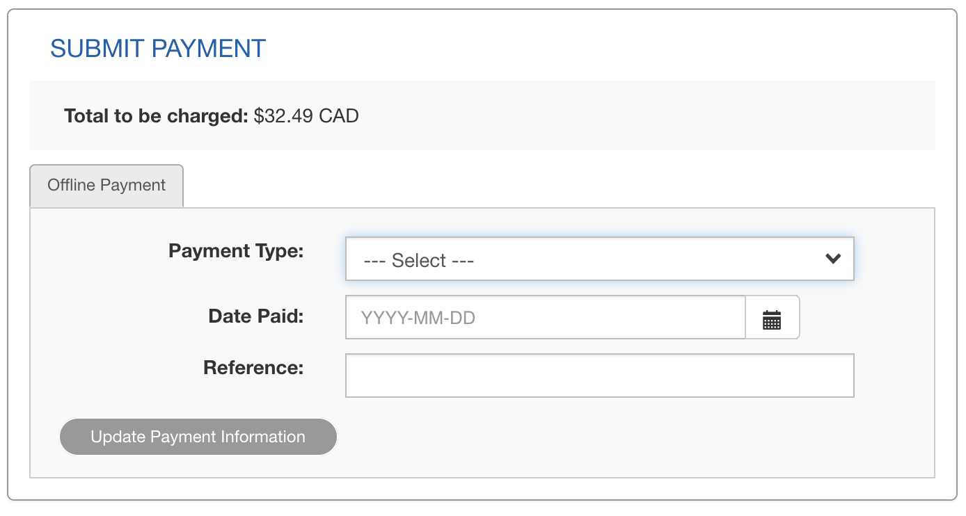- On the offline payment tab and select the method of payment that you received and the date when the payment was received and add a reference (eg : cheque number, receiver) and click on update payment information :