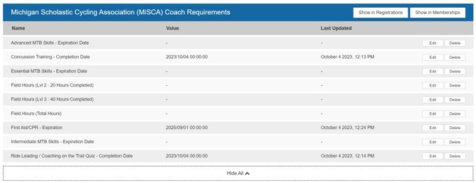 Common attributes for Coaches include things like Certification Dates (Concussion Training, Abuse Awareness Training, etc etc).