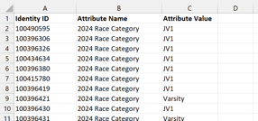 Common attributes for Athletes attributes include Race Category, Plate/Bib Number, etc,