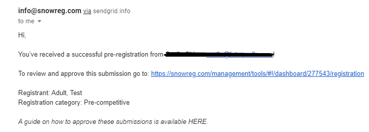 1. You will receive a notification email each time an athletes pre-registers, click the registration details link in the email.