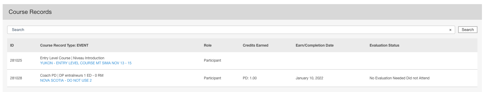 4- After saving the new registration, the course record will be displayed in the section of the user's profile dedicated to course records.