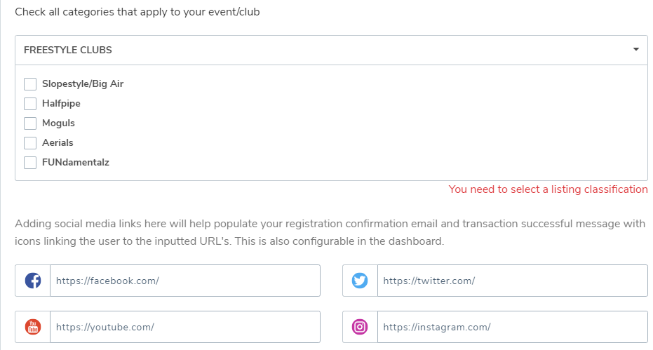 Then, you will be prompted to select your listing classification and to add your social media links. Choosing the appropriate classification will help the registrant find your event/club more easily in the search function of your directory.