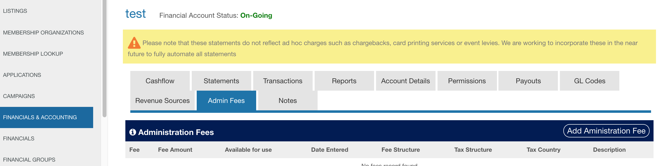- From the drop-down menu at the top of the page, select the financial account under which you’d like to charge fees.