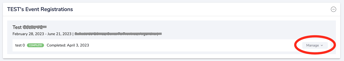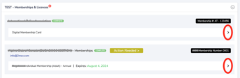 Next, choose the membership or registration you want to access the agreements for. Simply click on the arrow (or manage menu) located in the far right white section, which includes the name of the membership or registration: