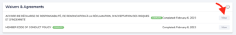 Once you've open your membership or registration details, scroll down to access the Waivers & Agreements section, and click view to access the content of the signed waiver: