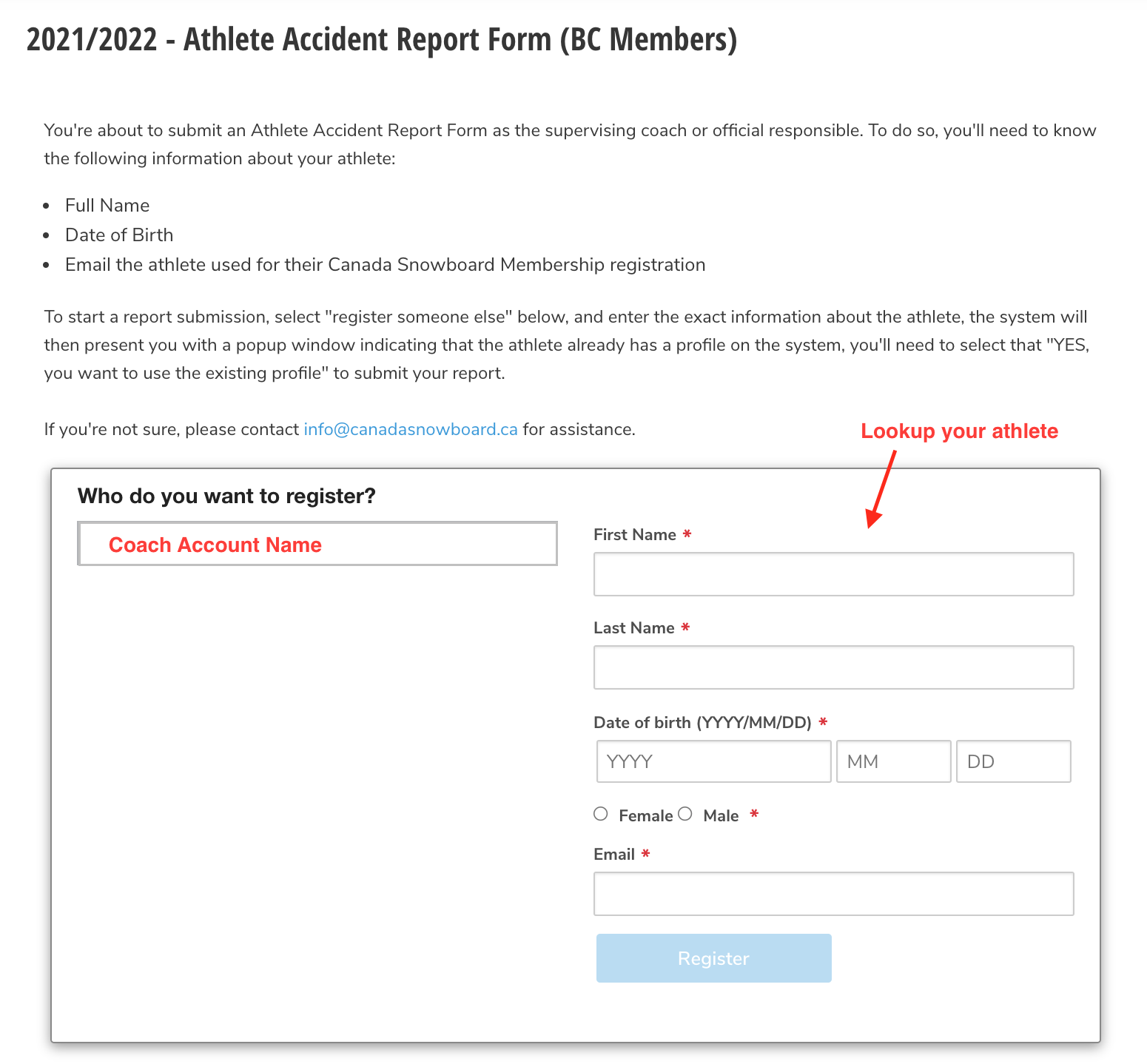 - Once on the form (link above), select "register someone else" and lookup the athelete