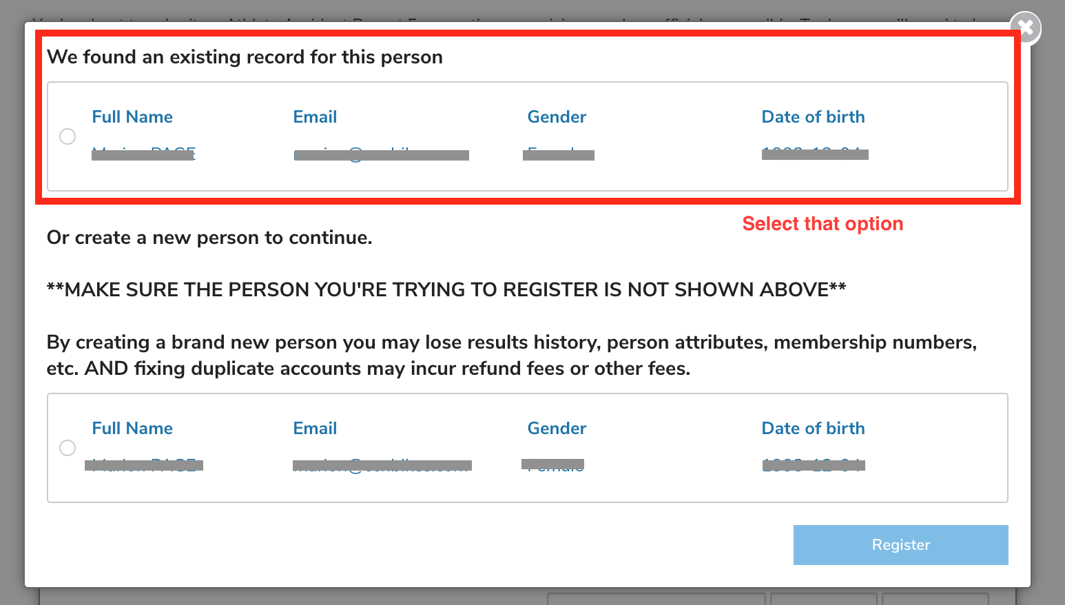 - If you've entered the proper information about the athlete, you'll be able to select "use the existing profile"