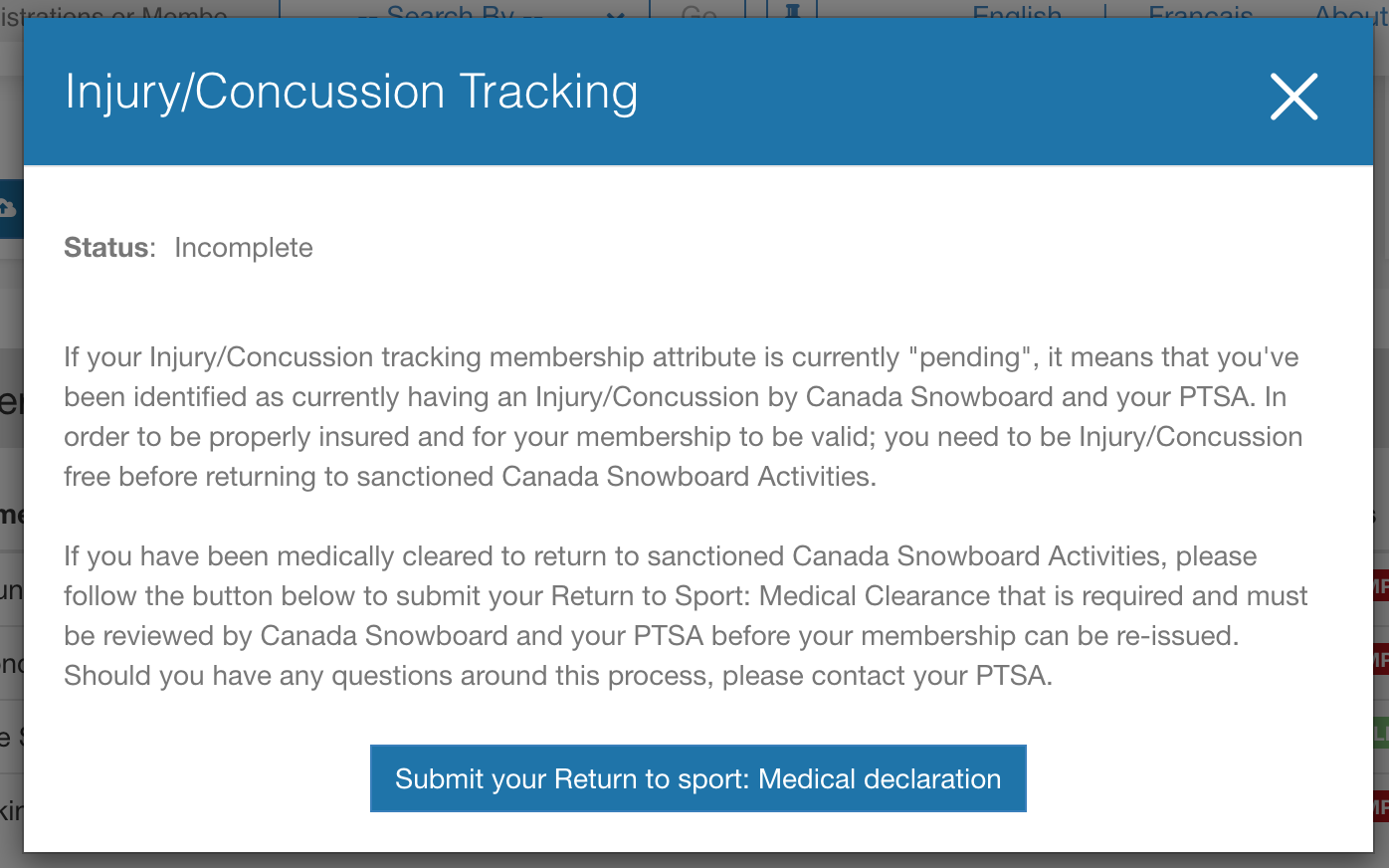 - If the member logs in on their Snowreg account, they’ll be able to access the membership details, see that the injury/concussion requirement is incomplete, and by clicking on “how to resolve” he’ll access a pop up saying: